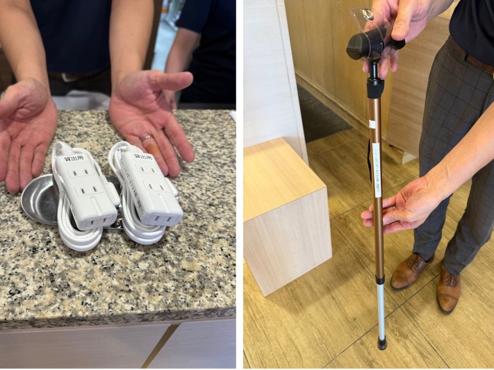 ご高齢者・足腰が不自由なお客様にも安心してご利用いただけるよう、杖や延長コード等の備品貸し出しを行っております。